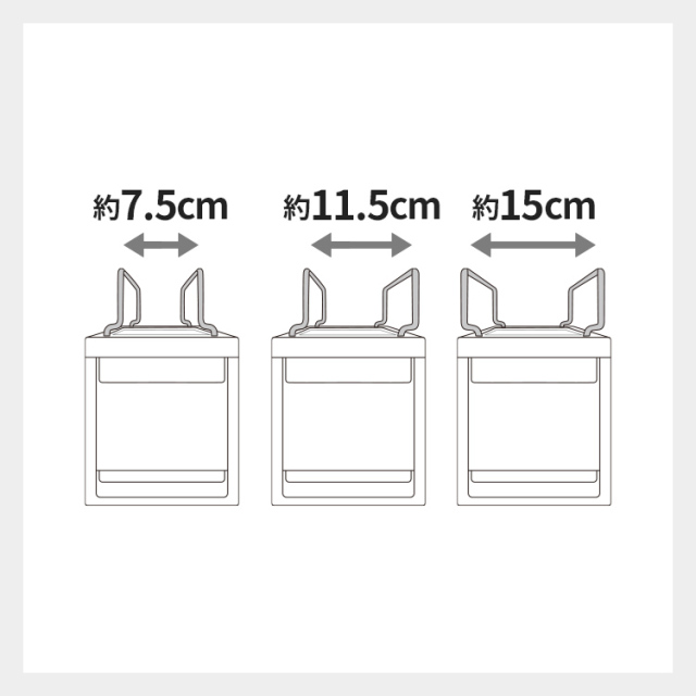 ワイヤーを差し込む向きによって、鞄置きの幅を3段階に調節できます(幅7.5、11.5、15cmの3段階調整です。)