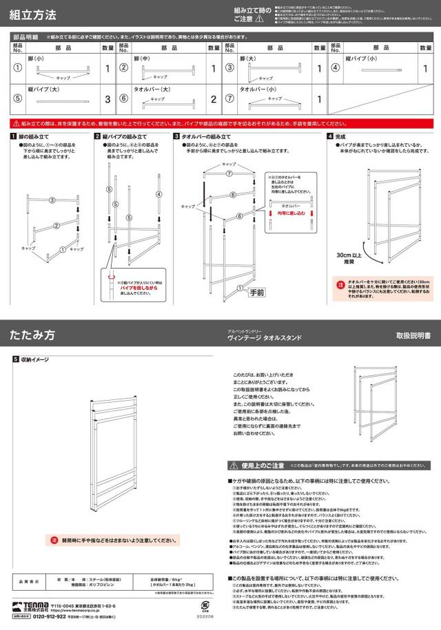 ※タオルバーは十分に開いてご使用ください。(30cm以上推奨) - 組立説明書