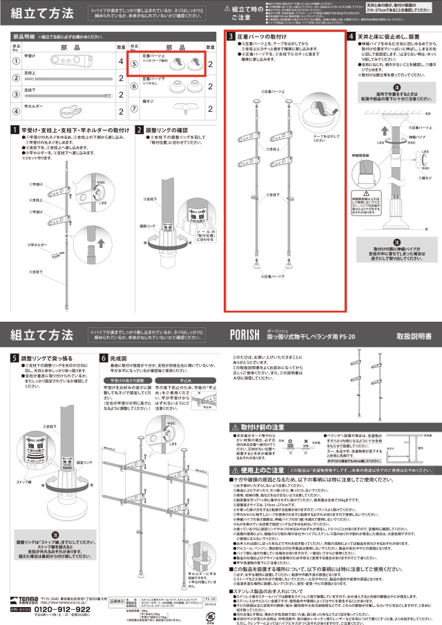 ポーリッシュ 突っ張り式物干し ベランダ用 PS-20 組立式 - 組立説明書