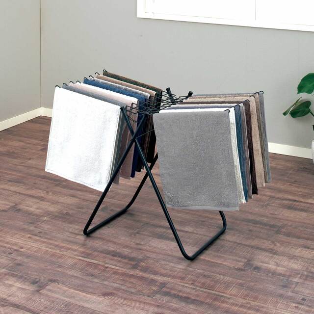 フェイスタオルが16枚干せるタオルハンガースタンドです。パッと出せて収納するときは非常にコンパクトに折りたたみ可能。タオルを効率的に干してみましょう。