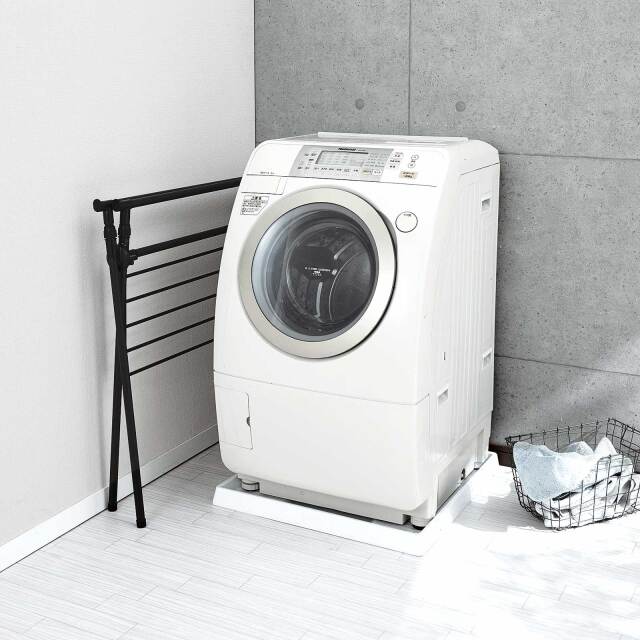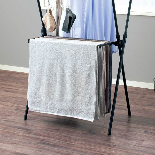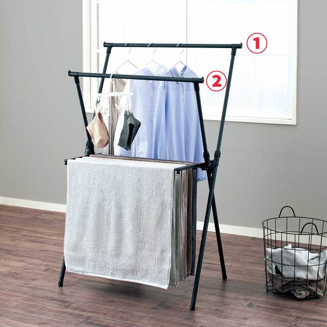 2本の竿で衣類や小物など様々なものを干せる室内物干しです。床からの高さも充分に確保し、バスタオルも干すことが可能。使用しない時はスリムに収納もできます。