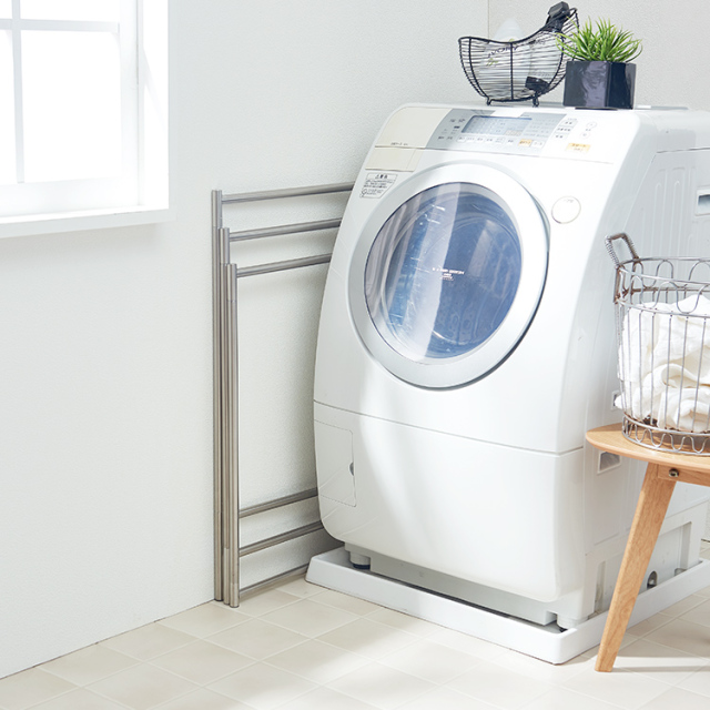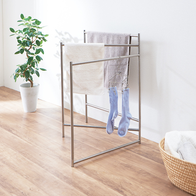 圧迫感のない非常にコンパクトなサイズなので、ちょっとした小物を干す際にもオススメです。 ※片寄った掛け方をすると転倒する危険がありますので、バランスよく掛けてください。
