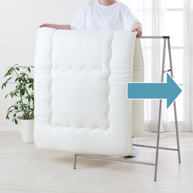 ふとんの掛けやすさにこだわり、さっと横から通すだけで干せる形状にいたしました。一人暮らしの女性でもスムーズにふとんが干せます。