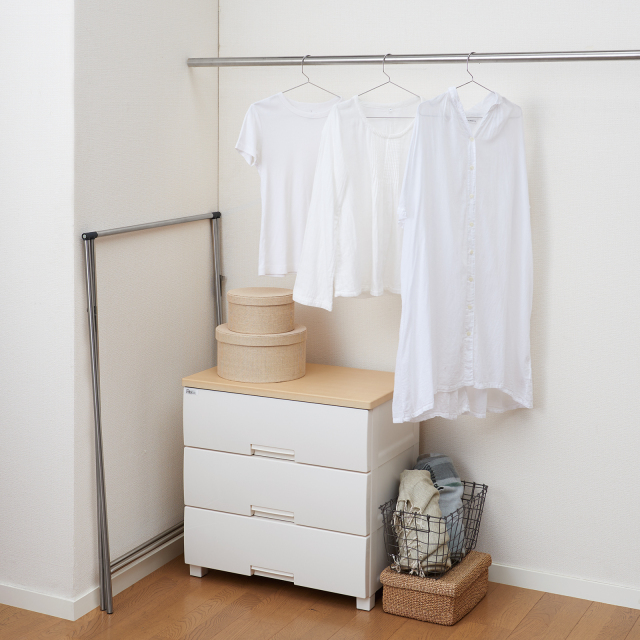 お部屋のインテリアとしても使えるシンプルなデザインに致しました。洋服をそのまま掛けることでハンガーラックとしてもおすすめです。