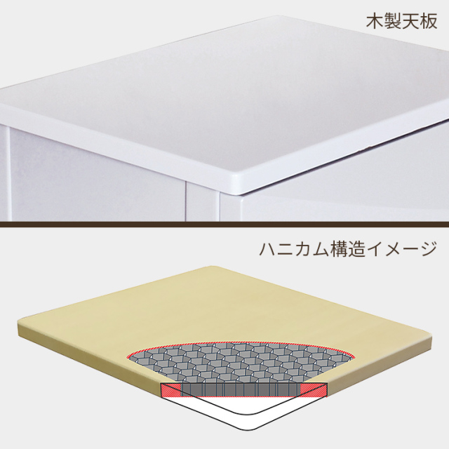 木製天板には、蜂の巣のように同じ大きさの六角形を敷き詰めた「ハニカム構造」を採用しています。軽くて丈夫な造りになっています。また、角が丸く加工されているので安心してお使いいただけます。