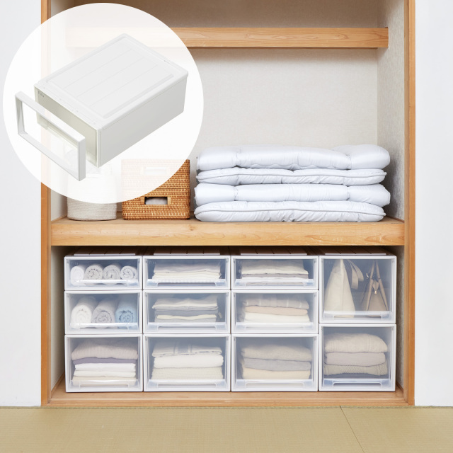 押入れのスペースに合わせて選べる豊富なサイズ展開。 衣類や寝具、小物まで収納しやすく、組み合わせ次第で使い方は自在。押入れをスッキリ整理し、収納力を最大限に活かせます。