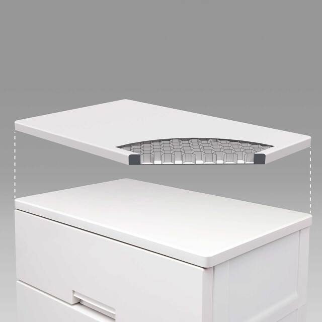 木製天板には、蜂の巣のように同じ大きさの六角形を敷き詰めた「ハニカム構造」を採用しています。軽くて丈夫な造りになっています。また、角が丸く加工されているので安心してお使いいただけます。