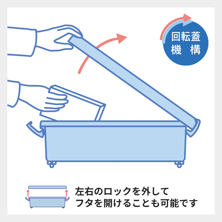 本体にロックが付いています。片方のロックを外すだけで回転蓋のように出し入れできるアップロック式です。