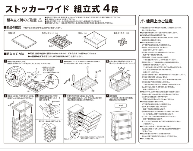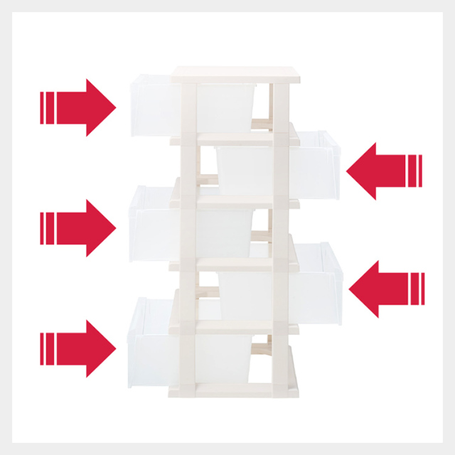 引き出す向きを前後2方向から選べるので、用途や場所に応じて両面使いも可能です。前後の方向性が無いため、組立間違いも発生しません。