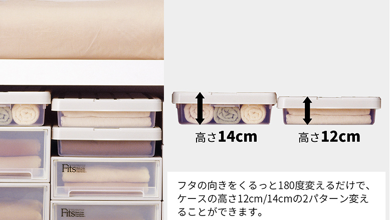 「フィッツケース スリムボックス 53」や「フィッツケース スリムボックス 74」は、豊富な種類と品質・機能を兼ね備えた天馬で人気のロングセラーアイテム。ベッド下スペースが低くてもすき間に活用できる、スリムで奥行きのあるふた付きボックスケースです。 フタの向きを180度変えるだけで、ケースの高さを12cmまたは14cmと2パターンから選ぶことができます。積み重ねても安定感を持ってスタックできる仕様です。サイズは2パターン、他の「フィッツケース」シリーズとも組み合わせて使えるため、ベッド下のみならず押入れやクローゼットでも活躍します。
