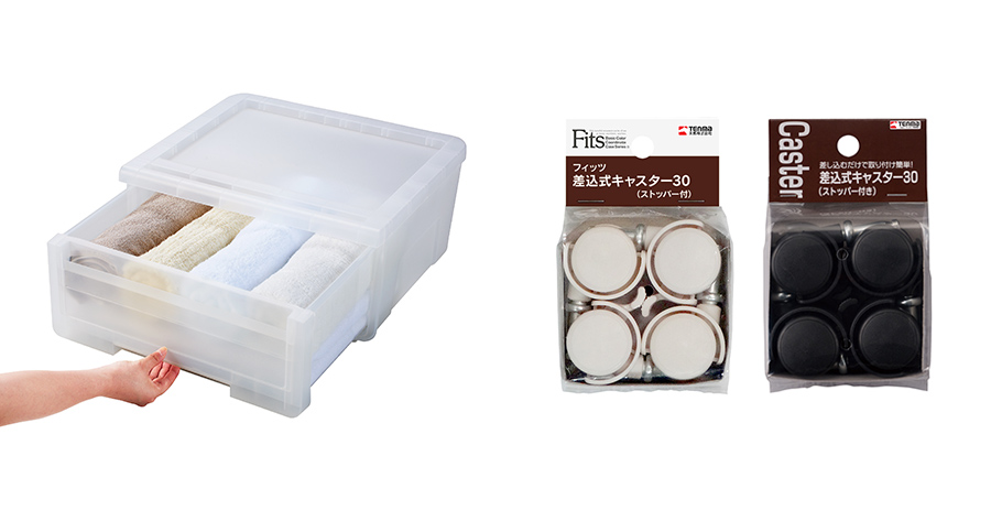 ベッド下スペースの高さが25cm~45cmあって、頻繁に出し入れするものを収納したい場合は、開口サイズが大きいこの「プロフィックス カバコ」シリーズがおすすめです。スムーズなスライド式でフタを本体に収納できるため、フルオープン状態で使用することもでき、ベッド下でも出し入れがスムーズです。豊富なサイズバリエーションを揃えていますので、工夫して組み合わせてみてください。移動に便利な差込式キャスター30(ストッパー付き)を付けることも可能です(キャスター使用時は高さが4cmアップします)。