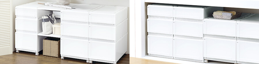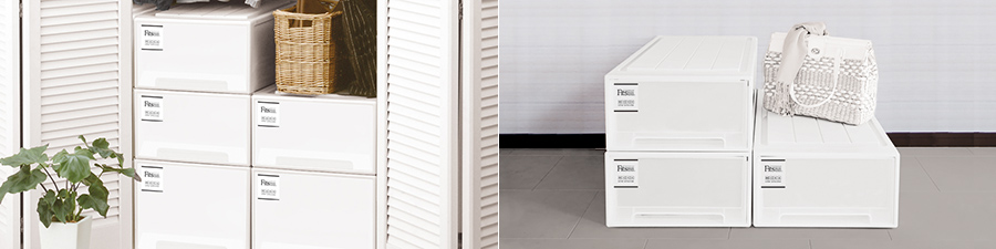 特に「フィッツユニットケース」は頑丈なので、冬物の衣類や子供のおもちゃ、ペットボトルなどの日用のストック品の収納などにオススメです。中でもホワイトタイプは透けないので、隠す収納にもピッタリです。